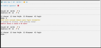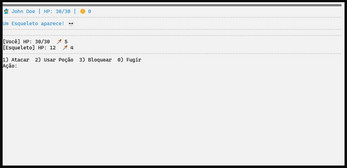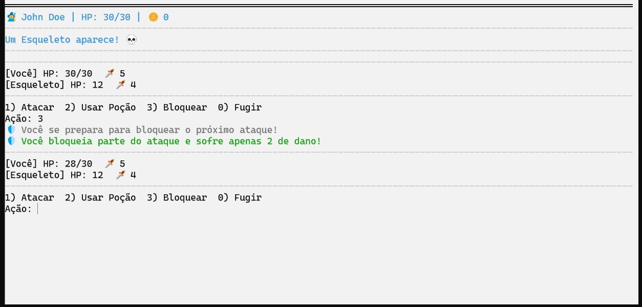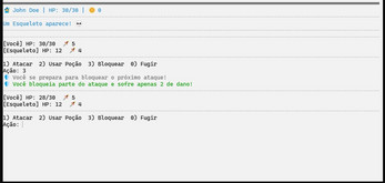 Foi adicionada a opção de bloquear ataques inimigos. Quando o jogador escolhe essa ação, o dano recebido é reduzido, criando uma mecânica de defesa que adiciona estratégia ao combate.